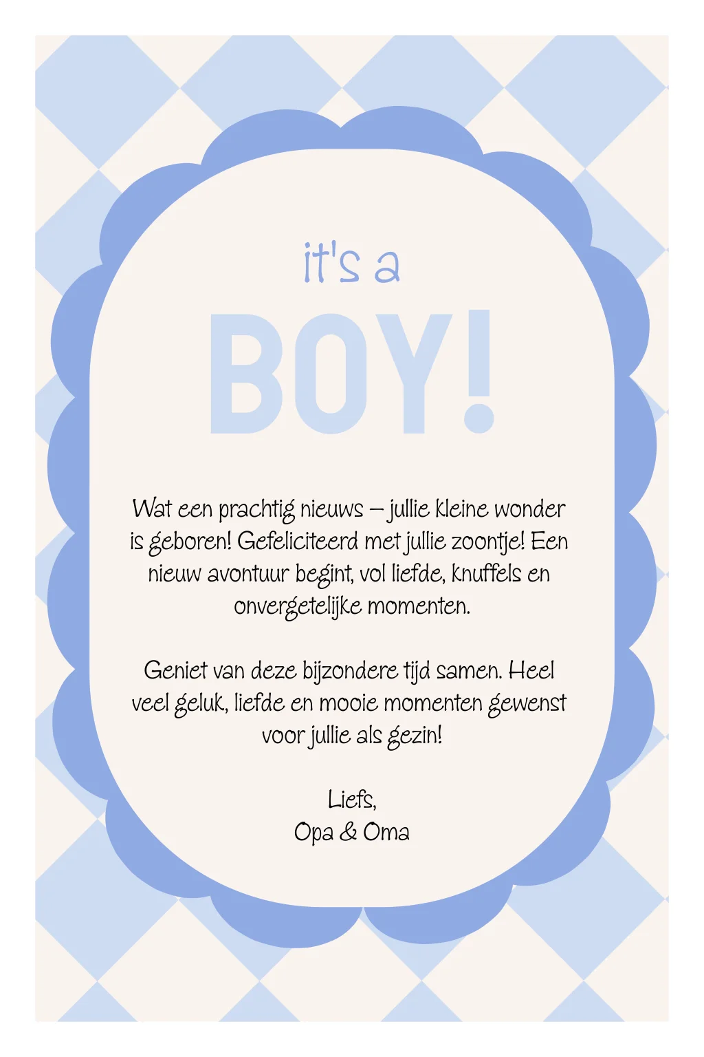 Is er een jongetje geboren? Stuur dan dit lieve kaartje met blauw colorblocking patroon en lijst mee met het kraamcadeautje. Pas de tekst aan naar jouw wensen. Dit doe je eenvoudig in de opmaaktool.