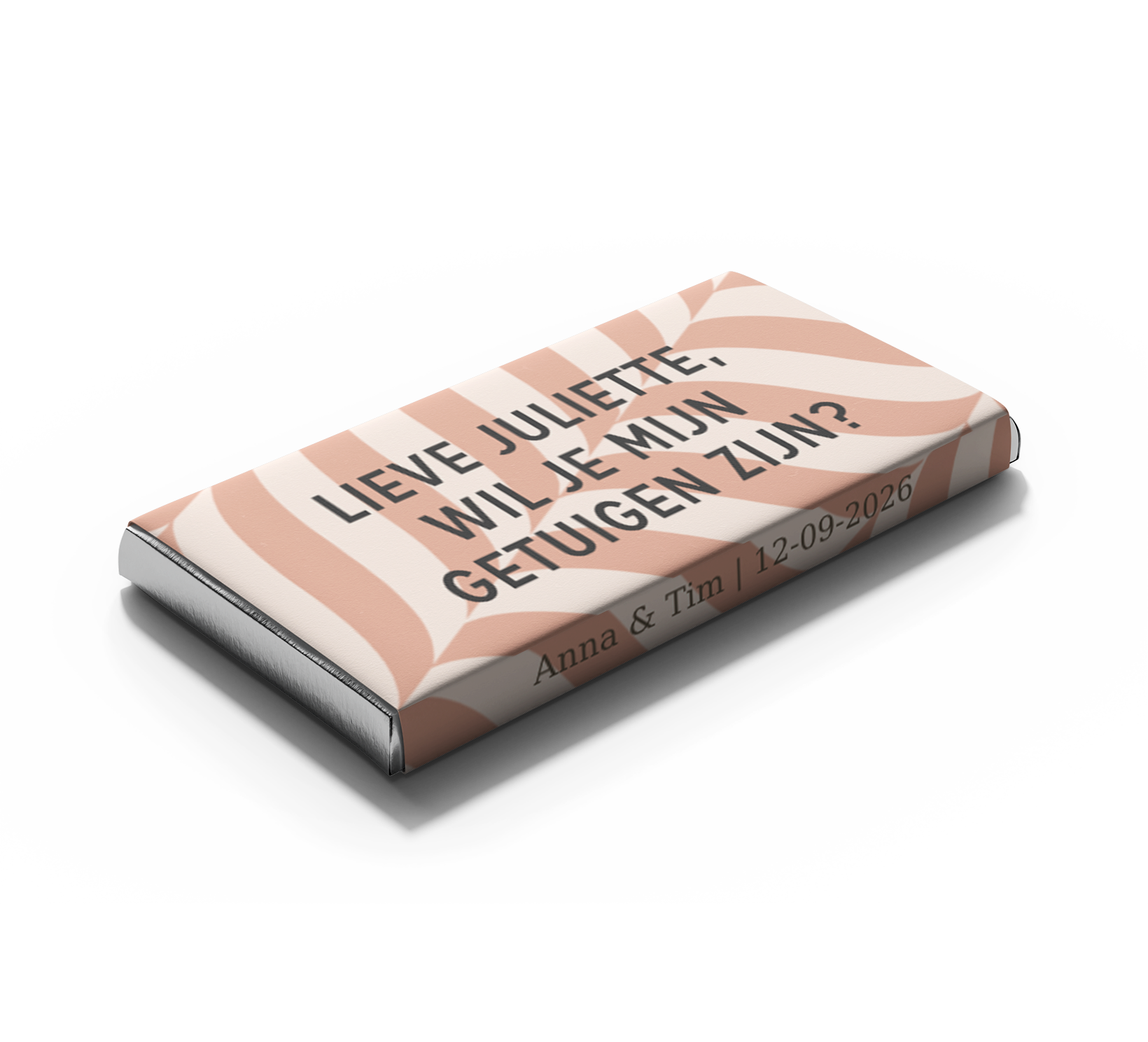 Tony Chocolonely reep met persoonlijke wikkel in bruin visgraat design om jouw getuige te vragen. Met de tekst 'Lieve ..., wil je mijn getuige zijn?' en aan de zijkanten jullie namen en de trouwdatum. Uiteraard is de naam op de voorkant aan te passen, evenals de namen en datum aan de zijkant.