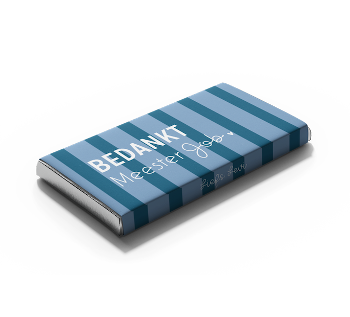 Geef de meester een uniek en gepersonaliseerd cadeau met deze wikkel en tony chocoladereep! De wikkel heeft een blauwe streepjes achtergrond. Daarnaast zie je de tekst: 'Bedankt Meester ... '. Pas de wikkel helemaal naar wens aan in onze online editor.