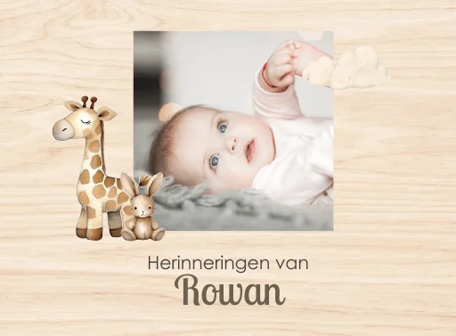 Nog een kraamcadeau nodig is? Dan is een herinneringskist het ideale cadeau. Deze box is perfect om spulletjes en herinneringen in te bewaren van de babytijd en zwangerschap. Bedruk de kist met een foto van de kleine baby. Dit ontwerp bevat ook een schattige giraffe en konijntje met wolkjes. Onder de foto komt tekst te staan: 'Herinneringen van...' met de naam van je kindje. Pas de memorybox zelf aan in de opmaaktool.