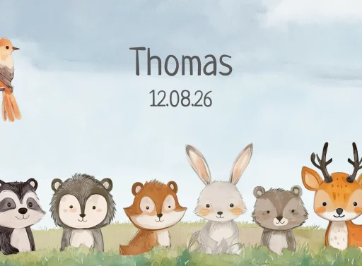 Een mooie herinneringskist met bedrukking van lieve bosdiertjes in het gras met blauwe lucht op de achtergrond. De kist is ideaal om spulletjes van de babytijd en uit de zwangerschap in te bewaren. De naam en geboortedatum van de baby kun je zelf aanpassen in de opmaaktool en komen in het midden van de kist te staan.