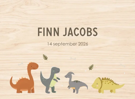 Hippe houten box als kraamcadeau of voor je eigen kindje. Deze houten herinneringskist is perfect voor spulletjes uit de zwangerschap en babytijd. Op deze kist zijn dino's te zien met de naam en geboortedatum van het kleintje. Pas de memorybox eenvoudig zelf aan.