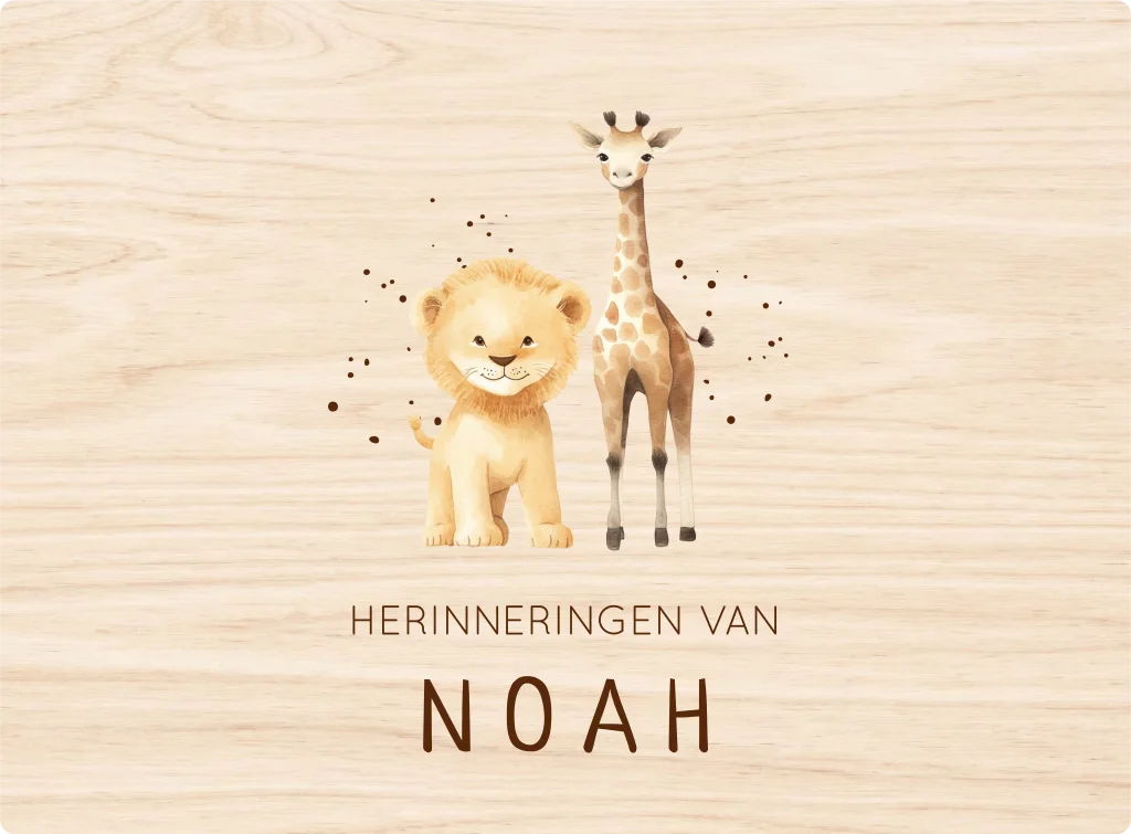 Een herinneringskist is ideaal om spulletjes uit de babytijd en zwangerschap te bewaren voor later. Ook heel leuk om als kraamcadeau te geven. Deze kist wordt bedrukt met een giraffe, leeuw en aquarelachtergrondje met stippen met daaronder de tekst 'herinneringen van' en de naam van de baby. Pas de box aan in de opmaaktool.