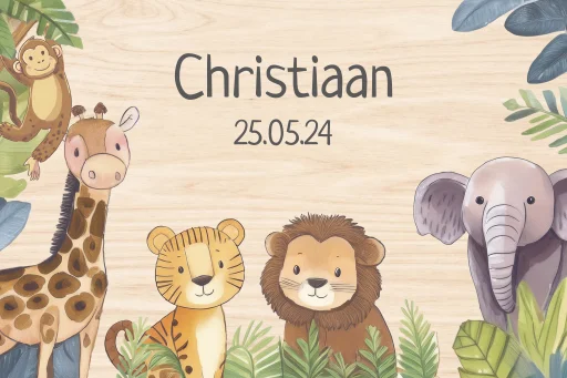 Mooi houten kist om spulletjes van de babytijd in te bewaren. Ideaal als kraamcadeau. Op deze herinneringskist worden safaridieren zoals een aap, giraffe, tijger, leeuw en olifant gedrukt met in het midden de naam en geboortedatum van je baby. Pas de kist naar eenvoudig aan in de opmaaktool.
