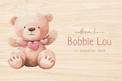Een herinneringskist is een super leuk kraamcadeau zodat de spulletjes van de pasgeboren baby goed bewaard kunnen worden. Deze memorybox wordt bedrukt met een schattige teddybeer met hartjes in watercolour stijl. Naast de beer staat de tekst 'Welkom lieve' en de naam en geboortedatum van de baby. Pas de tekst op de box eenvoudig zelf aan in de opmaaktool.