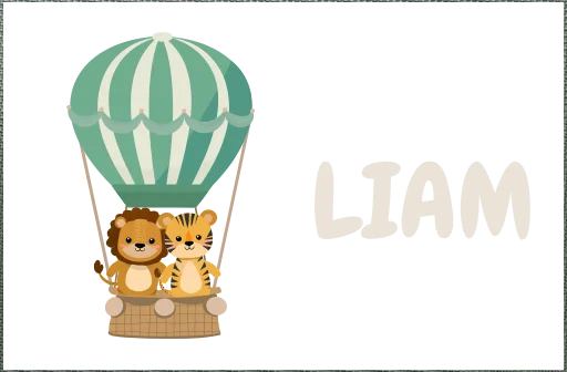Een vrolijke toilettas. Op de voorkant staat de naam en een illustratie van een luchtballon met safaridieren afgebeeld. Pas de toilettas gemakkelijk aan in onze editor.
