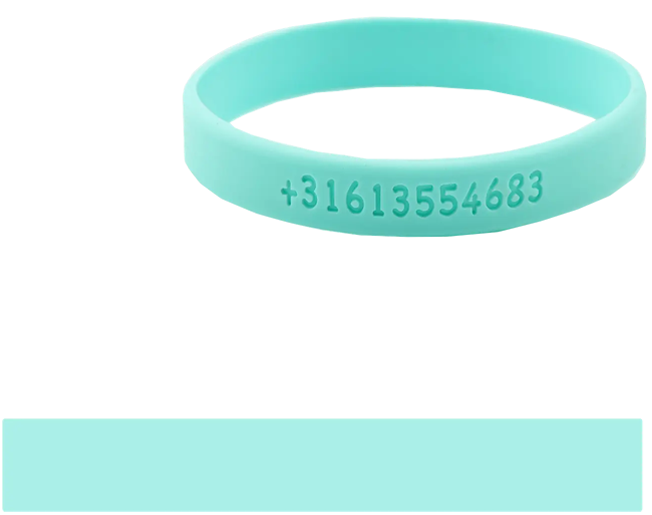 Een SOS bandje voor jouw kind. Laat de naam of een telefoonnummer op het bandje graveren. Op de afbeelding zie je een voorbeeld van hoe de tekst in het bandje wordt gegraveerd.