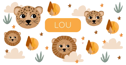 Een toffe RVS drinkfles met naam. De fles heeft illustraties van leeuwtjes, panters en wolkjes. In het midden lees je de naam. Pas het ontwerp naar wens aan.