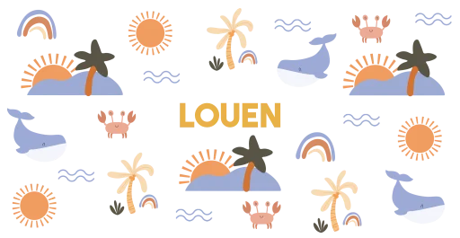 Een toffe RVS drinkfles met naam en zomer thema. De fles heeft illustraties van walvissen, krabben, strand en palmbomen. In het midden van de fles lees je de naam. Pas het ontwerp naar wens aan.