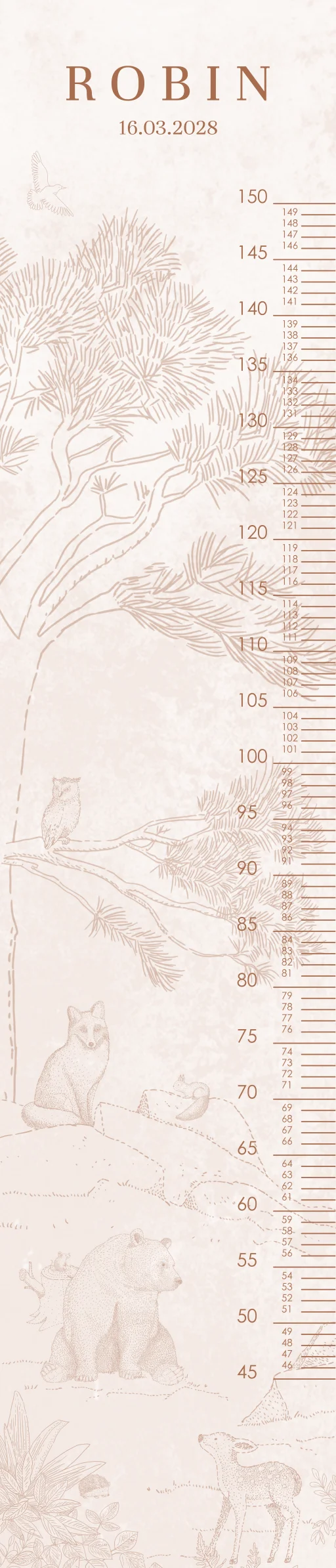 Deze groeimeter is leuk voor de kinderkamer van je eigen kind of om cadeau te doen! Op de groeimeter zijn een uil, vos, eekhoorn, beer en hertje te zien. De bruintinten geven deze groeimeter een rustige uitstraling. De groeimeter is helemaal naar wens aan te passen in onze online editor.