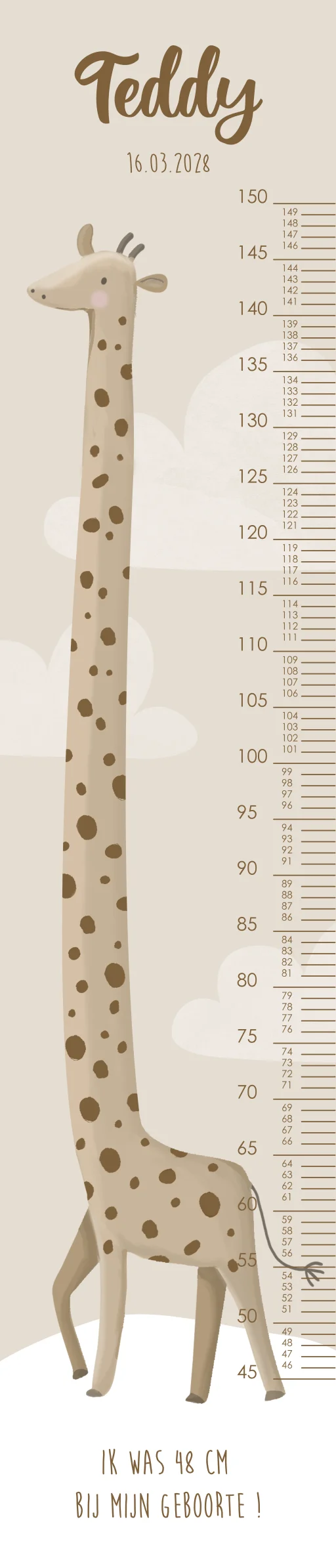 Deze groeimeter is leuk voor de kinderkamer van je eigen kind of om cadeau te doen! Op de groeimeter is een giraffe te zien. De meter heeft verschillende beige en bruinetinten. De groeimeter is helemaal naar wens aan te passen in onze online editor.
