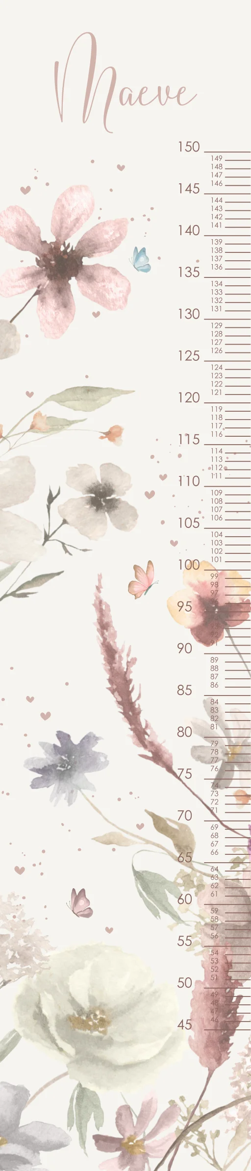 Geef de kinderkamer een persoonlijk tintje met deze groeimeter. De groeimeter heeft een lichte achtergrond met illustraties kleurrijke bloemen. De groeimeter is naar wens te bewerken in onze online editor.