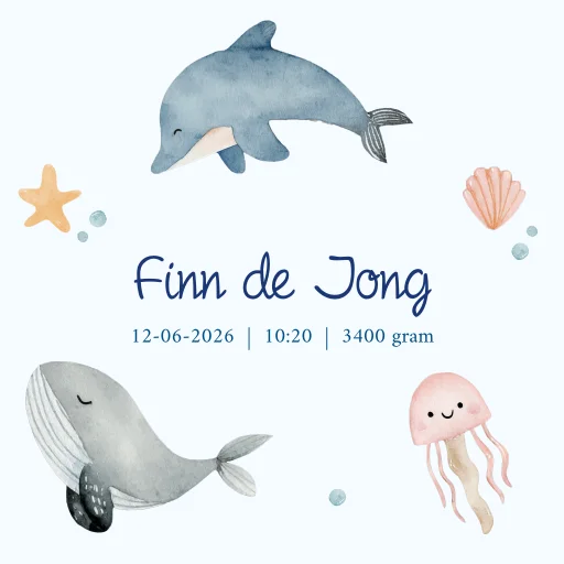 Duik mee in de zee naar de onderwaterwereld en fleur de babykamer op met een geboortetegeltje met onderwater dieren zoals een dolfijn, walvis en kwal. Super leuk om als kraamcadeau te geven door de naam van de pasgeboren baby en de geboortegegevens erop te laten drukken.
